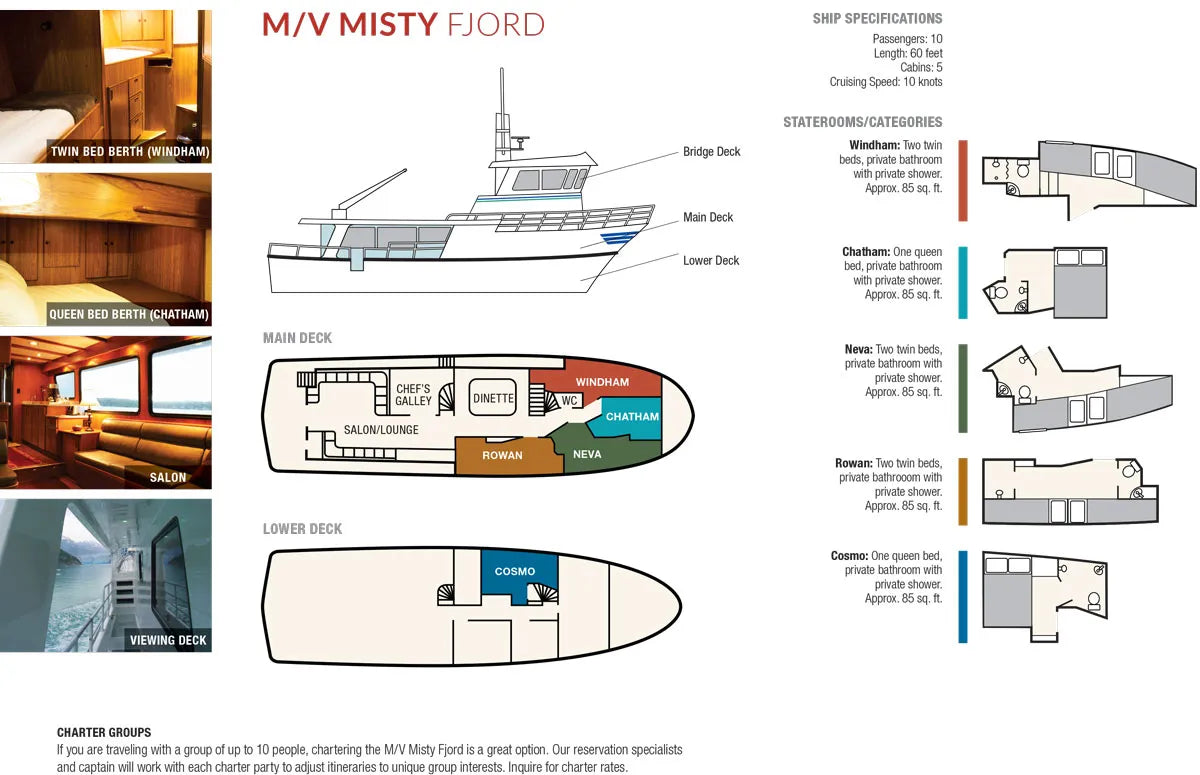 - Onboard Amenities – Tempur-Pedic bunks, private showers, premium toiletries, observation deck, and indoor common spaces